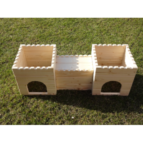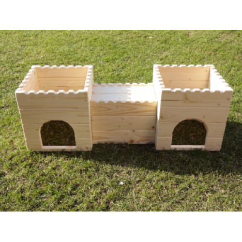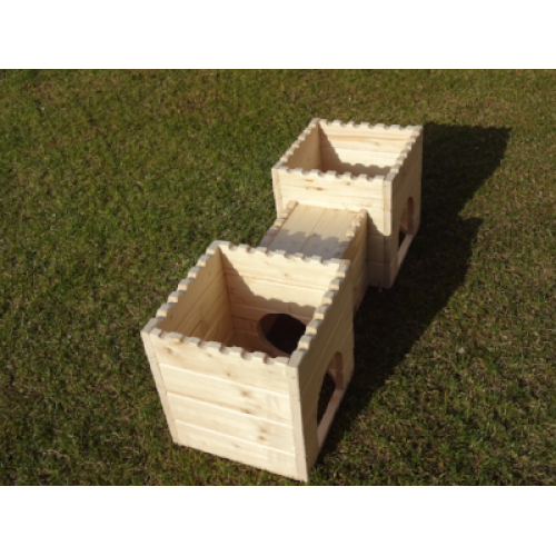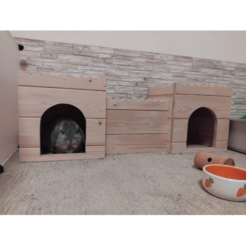 Stylový domeček - hrad - do výběhu vašeho mazlíčka. Dvě věže spojené dřevěným tunelem nabízí příjemný úkryt, možnost lehnout si nahoru či jen tak zvědavě vykukovat z okének. Věž/e je možné za příplatek opatřit podlahou/ami, ev. i přizpůsobit rozměry hradu vašemu individuálnímu přání. Na hrad si lze přiobjednat vypálení obrázku/jména vašeho mazlíčka (položka Vypálení obrázku/nápisu na náš výrobek), anebo nechat ozdobit dřevěnými výřezy ( položka Zdobení výrobku dřevěnými výřezy).