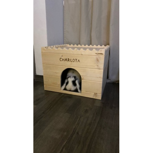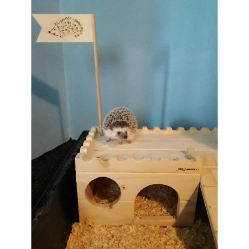 Domeček/hrad pro drobnějšího mazlíčka, např. morčátko či křečka. Může se schovat uvnitř, anebo si vylézt nahoru na terásku. Schodečky lze sundat. Na přání je možné vyřezat libovolný počet okének.