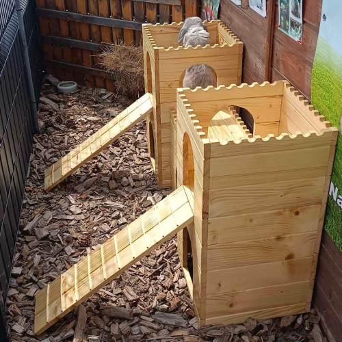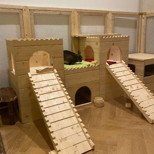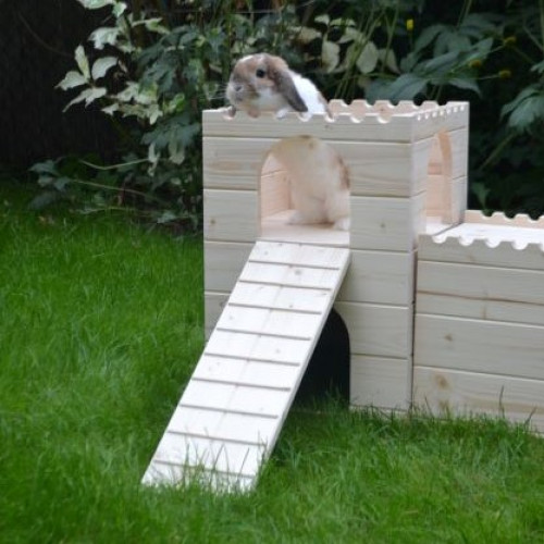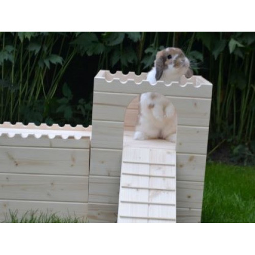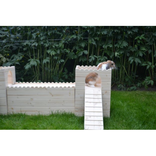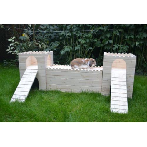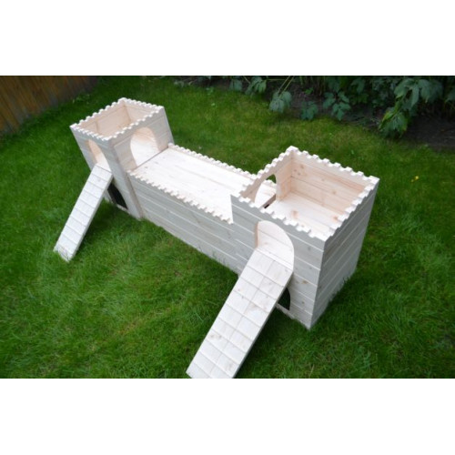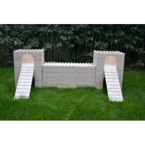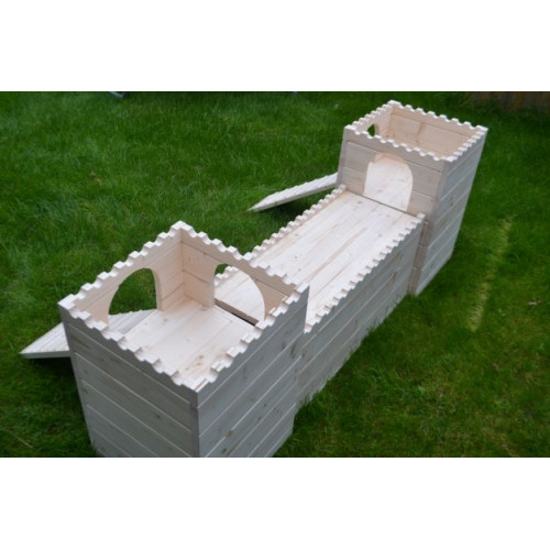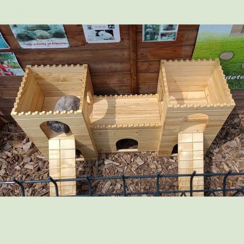 Prostorný stylový domeček - hrad - do výběhu vašeho mazlíčka, tentokrát v XL provedení. Dvě věže spojené dlouhým dřevěným tunelem nabízí příjemný úkryt, možnost lehnout si nahoru či jen tak zvědavě vykukovat z okének či vchodů. Věž/e je možné za příplatek opatřit podlahou/ami, ev. i přizpůsobit rozměry hradu vašemu individuálnímu přání. Do prostřed tunelu je možné vyřezat okénko či další vchod. Na hrad si lze přiobjednat vypálení obrázku/jména vašeho mazlíčka (položka Vypálení obrázku/nápisu na náš výrobek), anebo nechat ozdobit dřevěnými výřezy ( položka Zdobení výrobku dřevěnými výřezy).