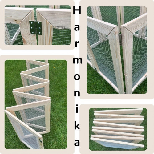 Ohrádku sestavíte i demontujete během chvíle pomocí pantů s demontovatelnými čepy, které kotví jednotlivé díly ohrádky k sobě. Každý díl ohrádky obsahuje panel o výšce 40/60/80 cm s přišroubovanými panty a 2 ks rektifikačních kluzáků k vyrovnání nerovností terénu do max. 1,5cm. Šířka panelu je 50 cm, + cca 1 cm mezera mezi panely. Cena je uvedena za jeden díl ohrádky příslušné výšky.