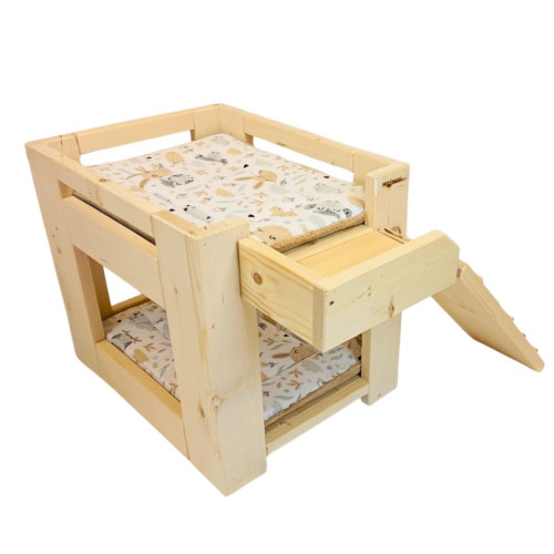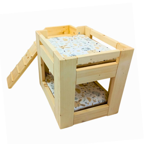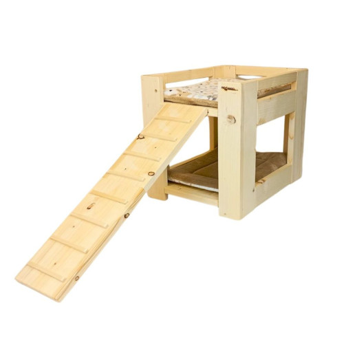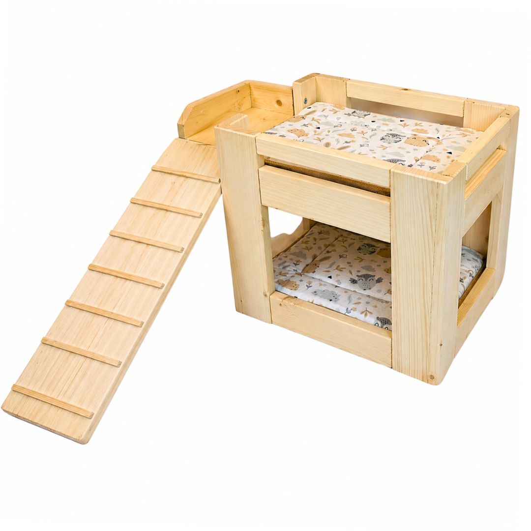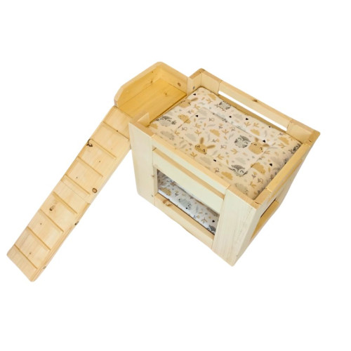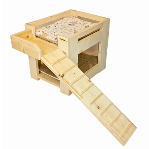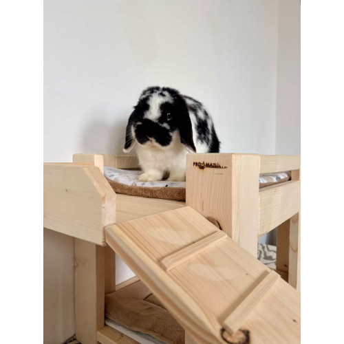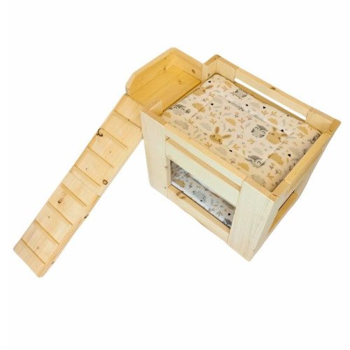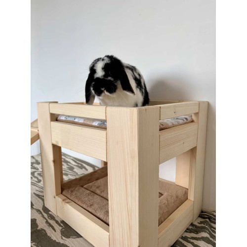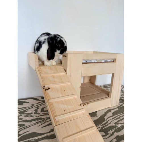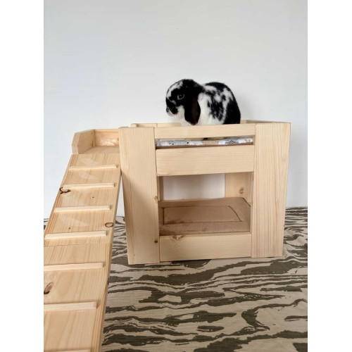 Palanda je ideální pro králíčky i morčátka a další tvorečky, kteří milují střídání skrýší a vyvýšených míst. Konstrukce je stabilní a dostatečně bytelná, aby poskytla bezpečné zázemí pro každodenní odpočinek i dovádění.