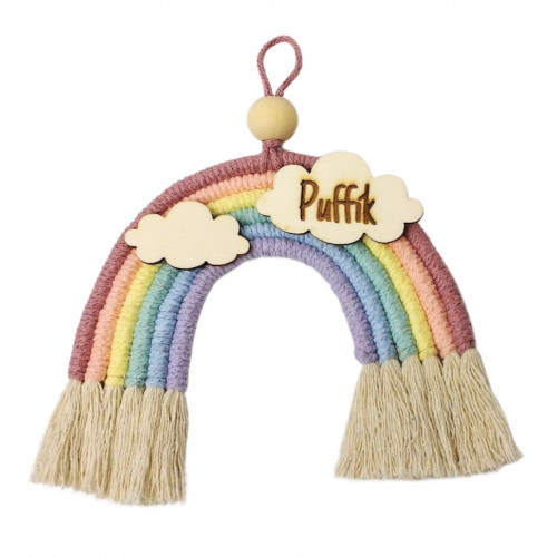 Ručně vyrobená dekorace/netradiční jmenovka s obláčky - nádherná duha vyrobená technikou macramé (drhání). Vyrobeno s láskou, nesmí chybět na zdi/dveřích mazlíčkovy ohrádky či pokoje :-) Vhodné také jako originální dárek... Do poznámky k objednávce prosím nezapomeňte připsat mazlíčkovo jméno.