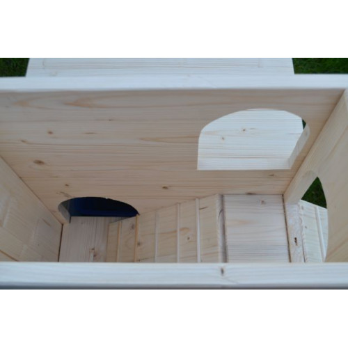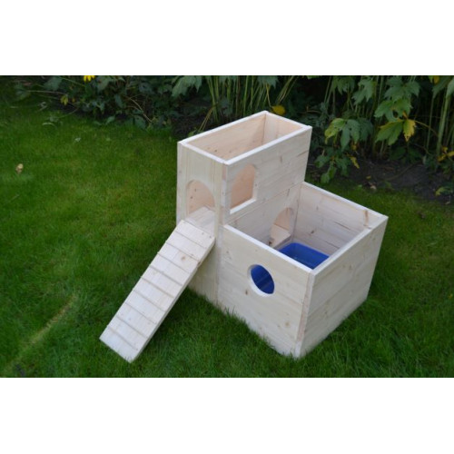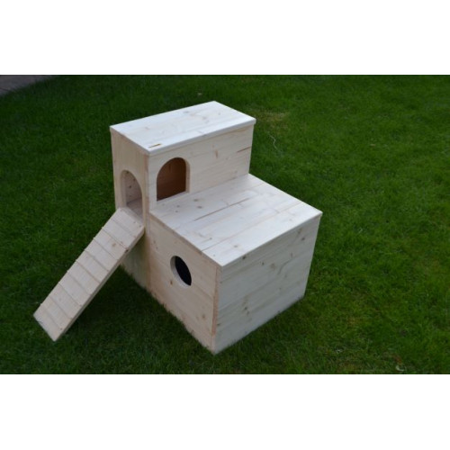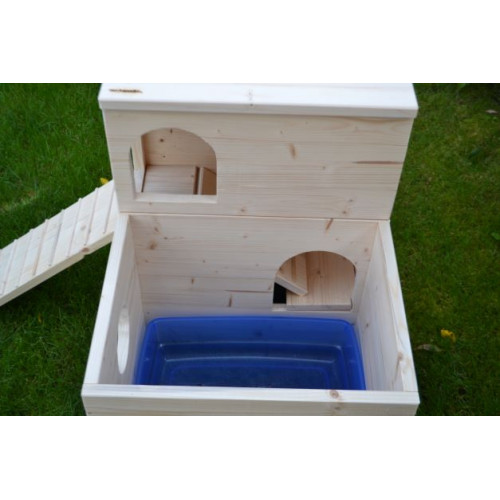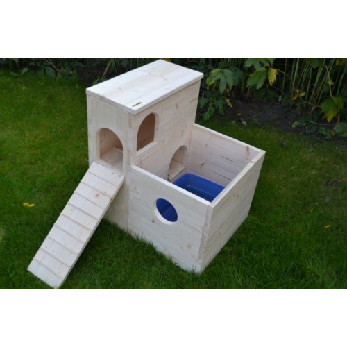 Řada mazlíčků ze své přirozenosti ráda tráví čas tím, že hrabe. Králíci se rádi přehrabují v písku, hlíně nebo třeba listí. Že byste jim to i rádi dopřáli, jen se bojíte bince všude kolem? Tak právě pro vás jsme vyvinuli naši hrabárnu. Je to v podstatě domeček, jehož součástí je i odnímatelná plastová vana. Aby se písek nesypal i s vylézajícím mazlíčkem, vymysleli jsme sofistikovaný oddělený boční vchod. Mazlíček si v naší hrabárně dokonce může poležet na "balkóně. Do plastové vany stačí dodat jen písek či jiný materiál a zábava může začít! Hrabárnu lze umístit jak do vnitřního, tak i venkovního výběhu. Kvůli snadné údržbě jsou obě střechy domečku sundávací.