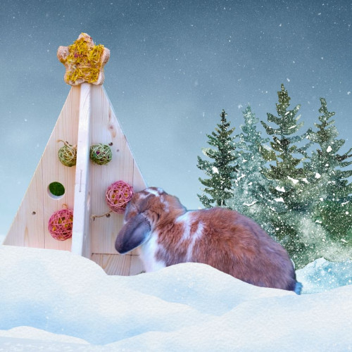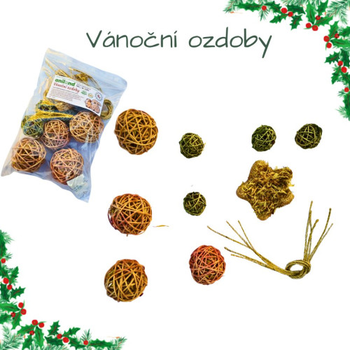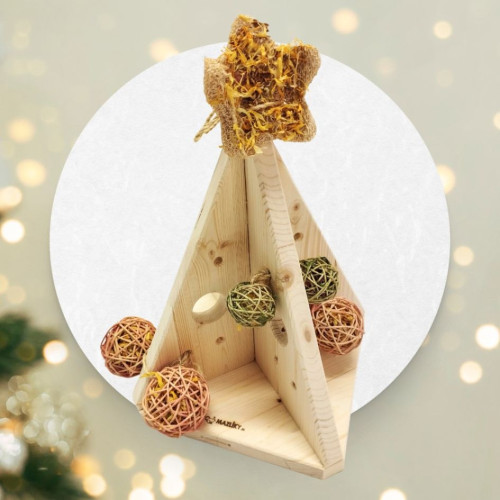 Představujeme vánoční stromeček -výsledek spolupráce Promazliky a Anilandu! I váš králíček či morčátko jistě ocení vlastní vánoční stromček, který může beztrestně mlsat a okusovat. Ve stromečku se ukrývá 12 malých a 4 velké otvory vhodné na přivázání/prostrčení různých okusovacích hraček, větviček či pamlsků. Stromeček dodáváme spolu s jednou sadou vánočních ozdob od Anilandu. Sadu je možné si dokoupit i zvlášť.