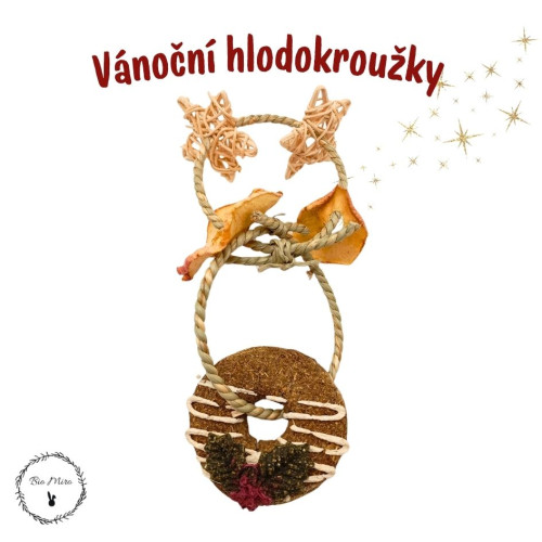 Na hlodokroužcích jsou navíc zavěšené domácí sušené plátky jablíček a proutěné hvězdičky, které dělají z každého kroužku krásnou a jedlou dekoraci.