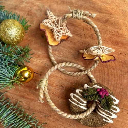 Dva věnečky z mořské trávy ruční výroby – pevné, voňavé a ideální k hlodání i přenášení.