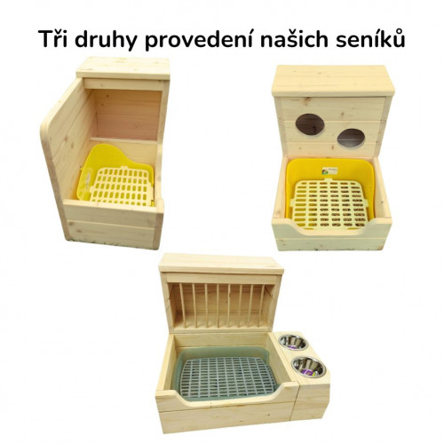 - Prostor pro seno nabízíme ve třech variantách, jako mřížku, otvory či korýtko (viz obrázek). Záleží jen na Vašem mazlíčkovi, který typ seníku nejvíce ocení. Nenapravitelní "vyhrabávači sena" či "hledači nejlepšího stébla až kdesi na dně jistě více ocení provedení "korýtko", provedení s otvory zase může nejvíce ladit páníčkovu oku. Pokud chcete lety prověřené klasické řešení, nešlápnete vedle s mřížkou (rozestupy tyčí 3,5cm od sebe)