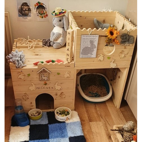 B/ jako úložný prostor pro potřeby pro králíčka (seno, krmivo atp.). V tomto případě z balkónku není vyřezán vstup, celý prostor tak je pro králíčka uzavřen (okénko nelze).