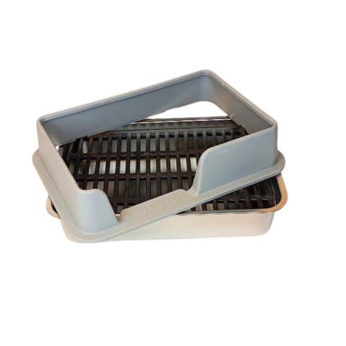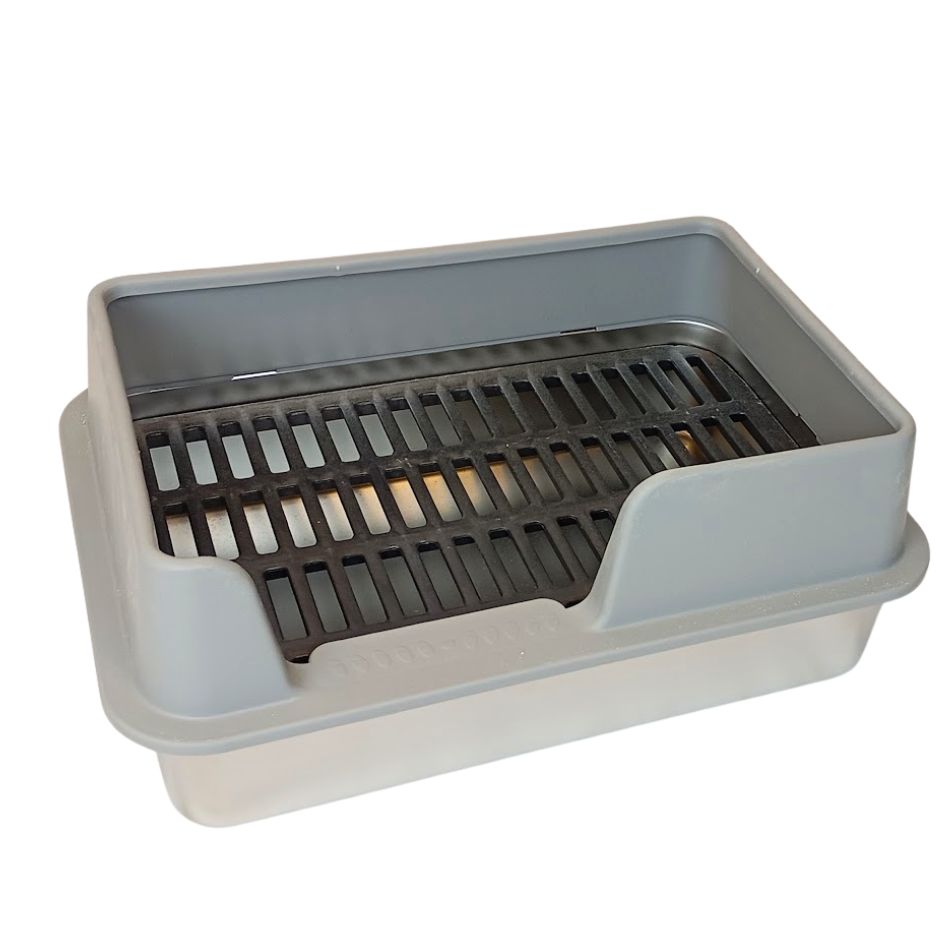 - je dopněna roštem, který si sami vyřezáváme z plastu. Rošt zabraňuje tomu, aby se mazlíčci v podestýlce nepřehrabovali, nevyhrabávali ji, neměli špinavé a vlhké tlapky. Rošt má dostatečně velké otvory pro propadnutí výkalů: 55x13mm - vhodné pro králíčky od hmotnosti 2 a více kg, u mláďat a menších králíčků hrozí poranění tlapky! Toaletu je možné smozřejmě používat i bez roštu.
