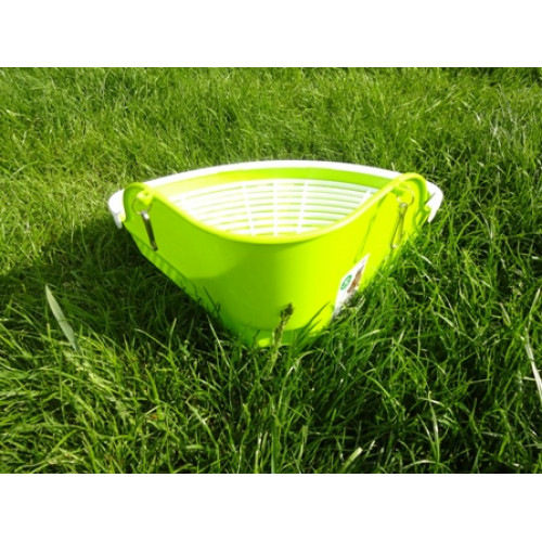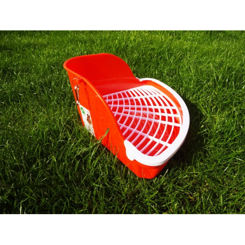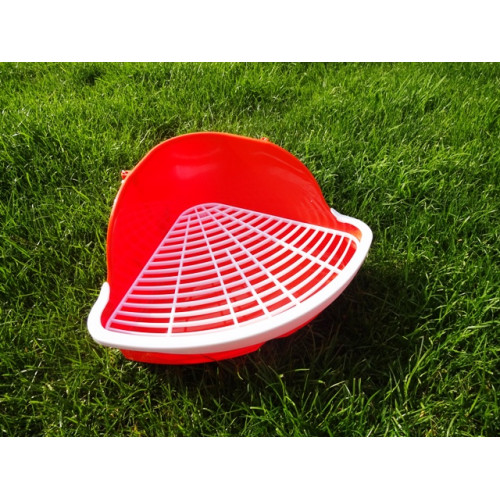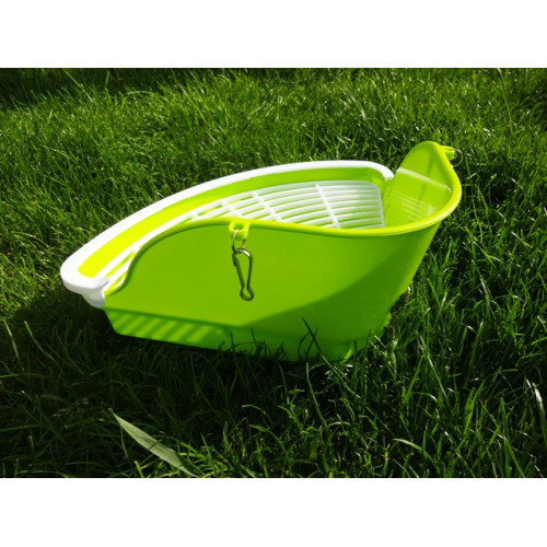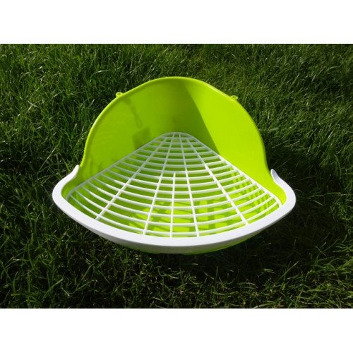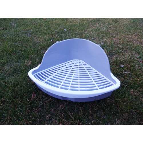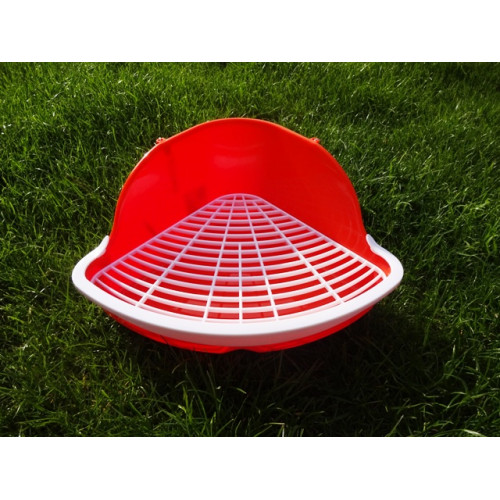 Praktické rohové WC s roštem pro zakrslé králíčky, morčata, fretky, potkany atp., které šetří místo. Plastový rošt má dostatečně velké otvory pro propadnutí výkalů, lze snadno nacvaknout na toaletu, zároveń ale na ní pevně drží, a tudíž se mazlíček dovnitř toalety k podestýlce nedostane. Vzadu praktické háčky na připevnění ke kleci/výběhu.