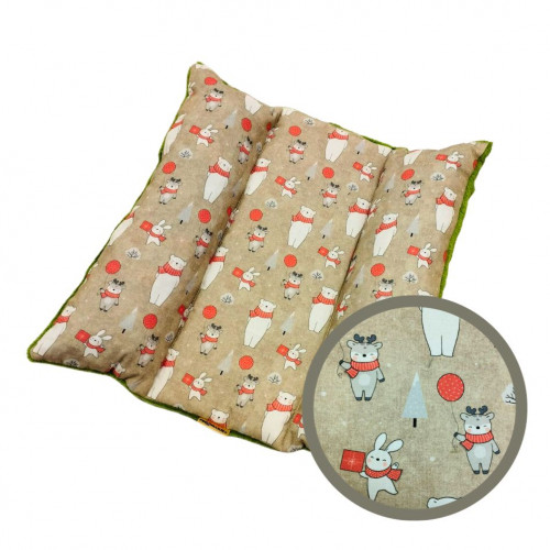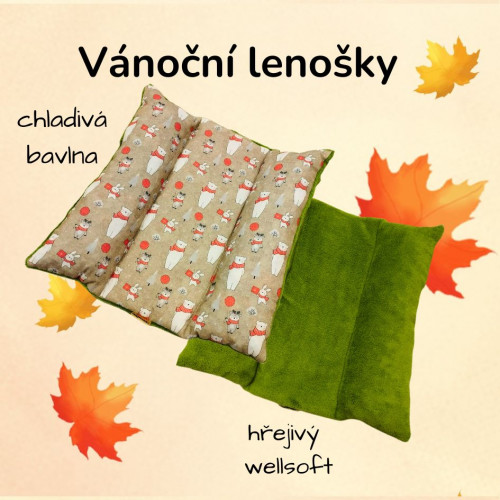 Vánoční verze našeho oblíbeného pelíšku je tu! Originální podložka na lenošení -měkký polštářek jako doplněk vhodný do klece, výběhu, auta, přepravky nebo kamkoli na místo, kde váš mazlíček rád odpočívá, tentokrát v oboustranné variantě v kombinaci materiálů: bavlna a flanel fleece. Vyvýšené okraje vycpané měkkoučkým rounem - válečky po stranách - simulují ležícího mazlíčka. Tento pelíšek totiž vychází z poznatku, že zejména králíčci rádi lehávají z důvodu pocitu bezpečí a tepla těsně vedle sebe. V originálním designu s vánočními zvířátky z příjemně chladivé bavlny na jedné straně a zhřejivéhowellsoftu v barvě jehličí na straně druhé. Prevence proti otlakům, lákavé místo k poležení.